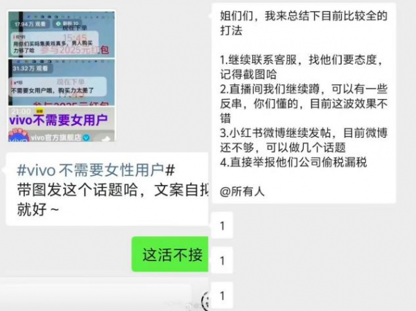 这一过程中,有人在vivo相关评论区刷屏:“bro别哭,吃散散热狗”,还有人在某微信群里发言,要求群成员发布“vivo不需要女性用户”等话题微博,文案自拟。