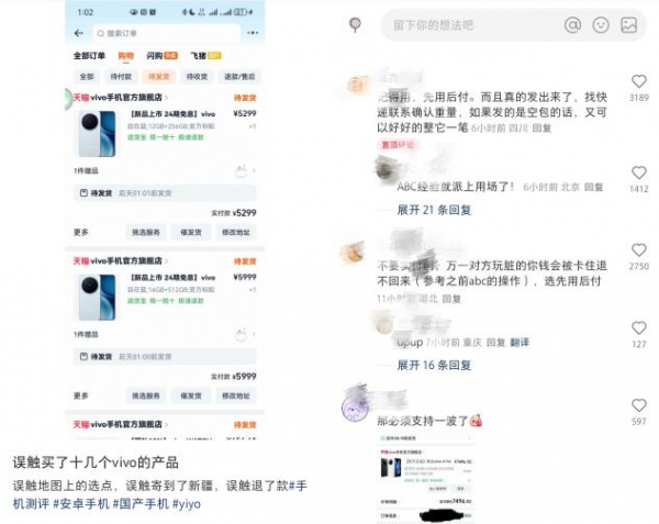 有人在网上下单vivo相关产品后,将收货地址填写成偏远地区,然后在快递即将送到时选择退货,试图对vivo完成虚晃一枪,这种行为不仅影响了客服、快递员的工作,甚至已涉嫌影响到一家企业的正常经营。