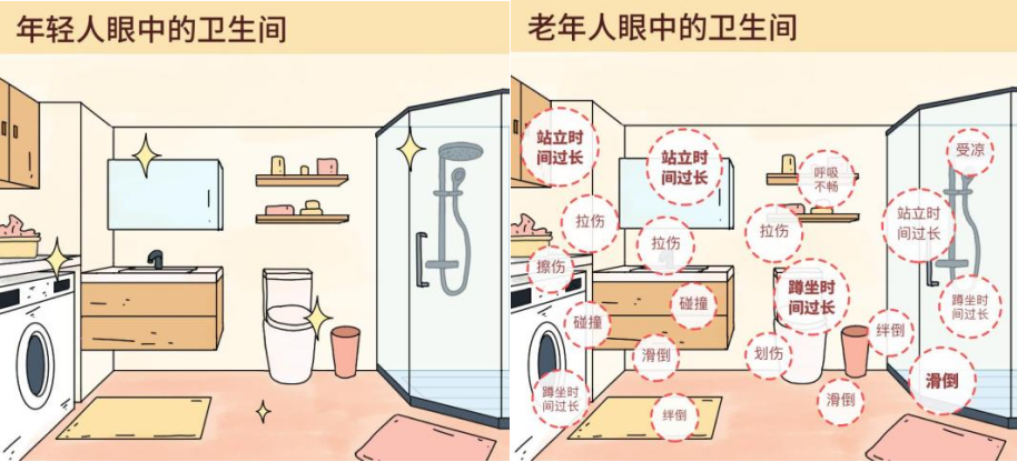 “卫生间的危险来自于湿滑环境、狭窄空间和频繁的体位变化三者叠加。”福满堂适老化改造服务平台创始人伯玉解释道。
