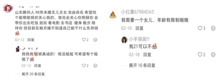 其实我们在小红书这样的社交平台中经常会刷到:“90后女生求本地干妈,可养老送终”“58岁独居阿姨招干女儿,提供住房与陪伴”等诸如此类的“认干亲”帖子。