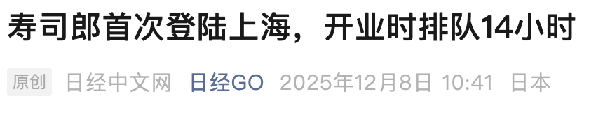 12月6日,寿司郎高调进入上海,开设环球港与中山公园龙之梦双首店。根据日经中文网报道,寿司郎开业排队时长一度长达14小时。