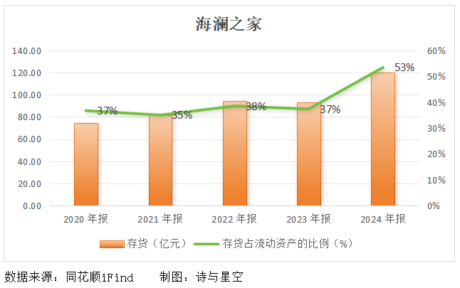 而销售端长期承压,也直接导致公司存货周转不佳。自2021年起,存货占流动资产的比例一路走高,超过50%,截止今年三季度末,该比例接近60%。