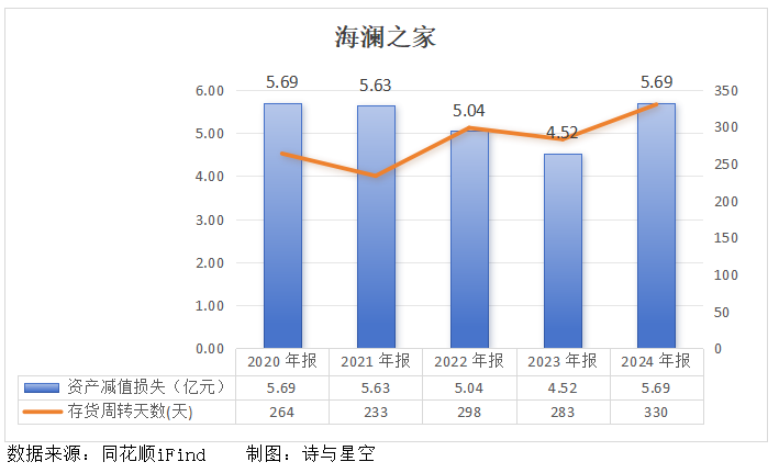 2024年末,存货周转天数上升至330天,也就是说,几乎需要11个月才能周转一次;全年确认资产减值损失约5.69亿元,全部来自存货跌价。