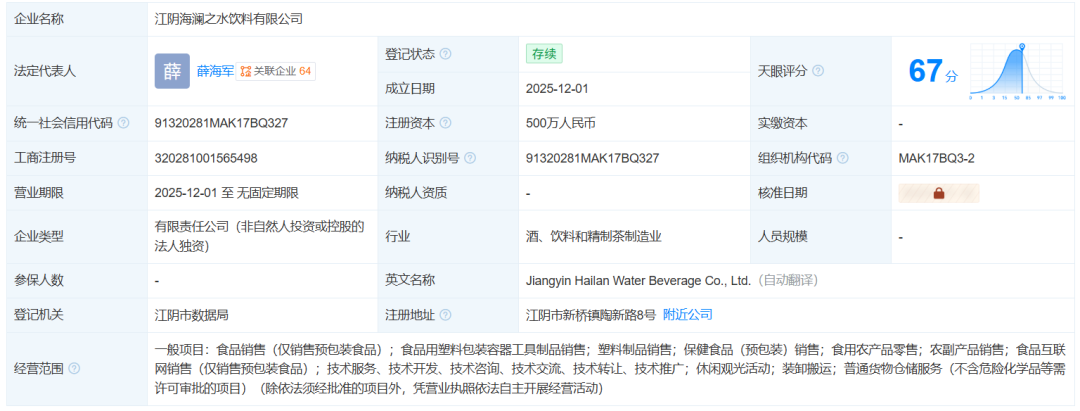 据天眼查显示,江阴海澜之水饮料有限公司注册资本500万人民币,由海澜之家品牌管理有限公司全资持股,其经营范围包括食品销售、食品用塑料包装容器工具制品销售、塑料制品销售、保健食品销售等。