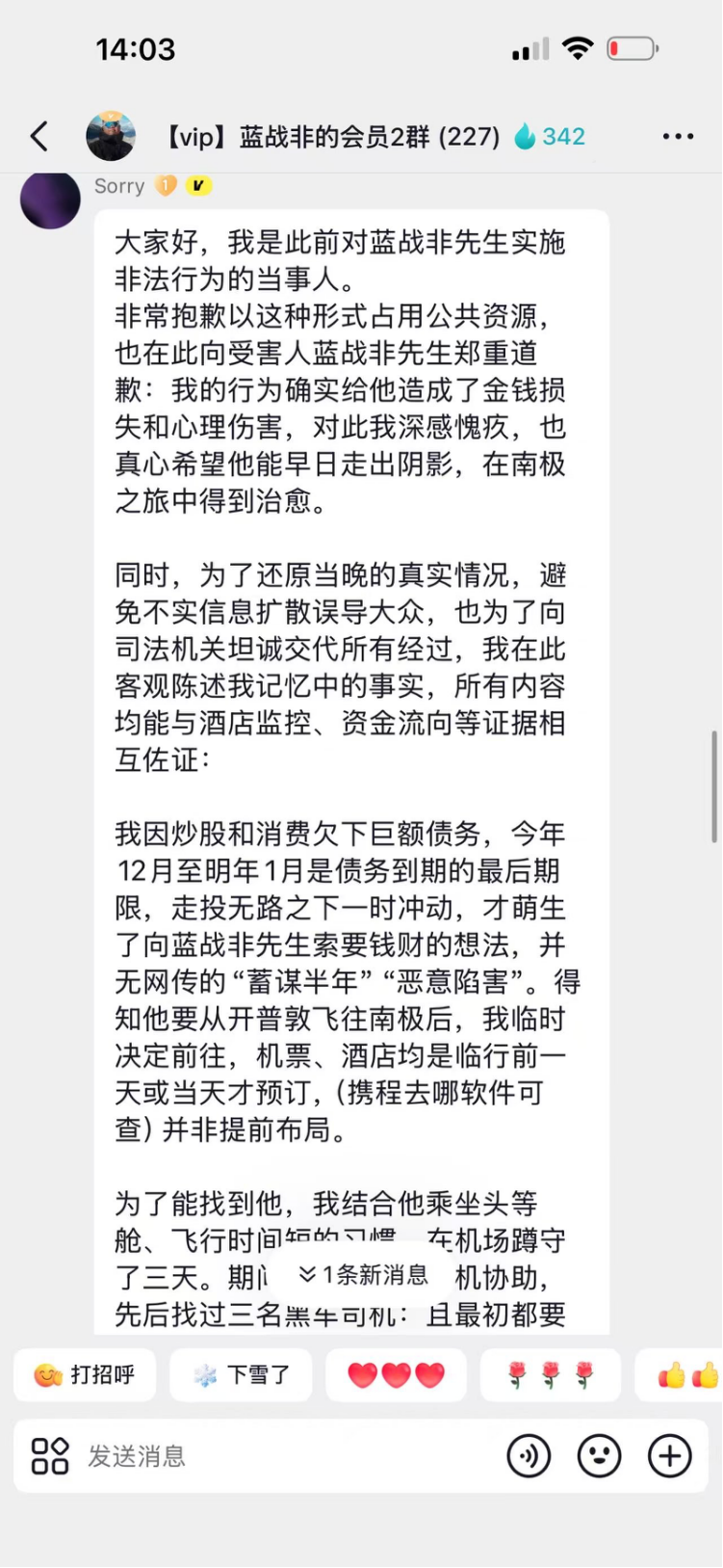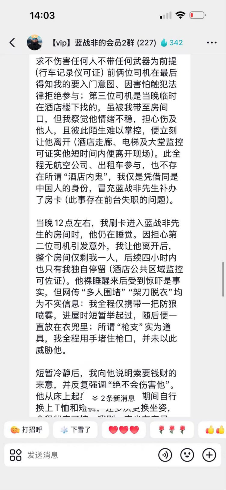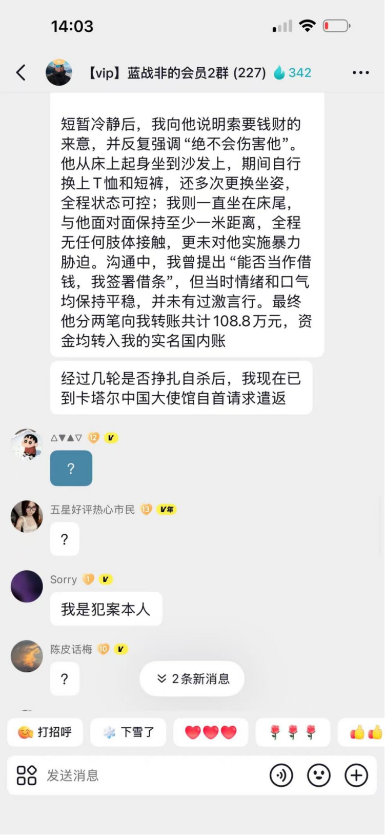 就在11日早上,我发现整个事件有了最新的进展,就在蓝战非的粉丝群里,一位粉丝承认了他就是这起事件的主谋,但事件经过有另外的说法:他只是个人作案,也没有提前半年策划,是临时起意,冒充了蓝战非补办了房卡,进了房间希望蓝战非能帮助他,也没有所说的几位黑人从犯等等,金额也就是108.8万,大家可以读一下他的发言内容。
