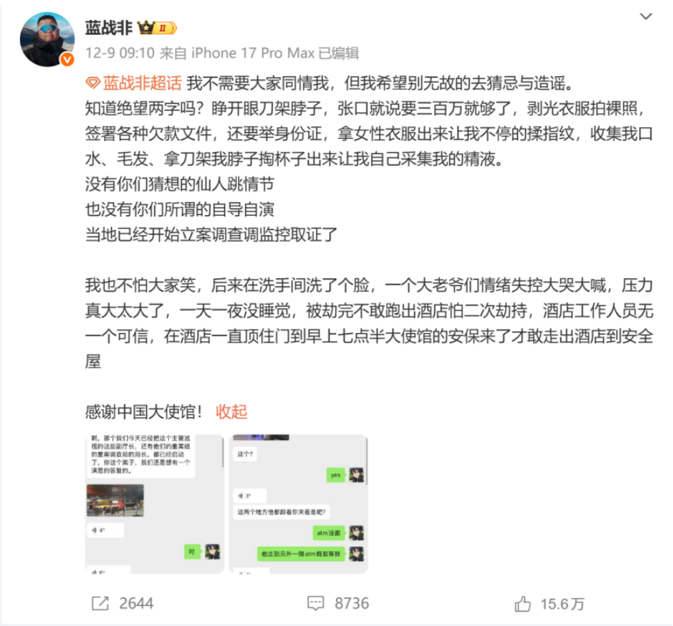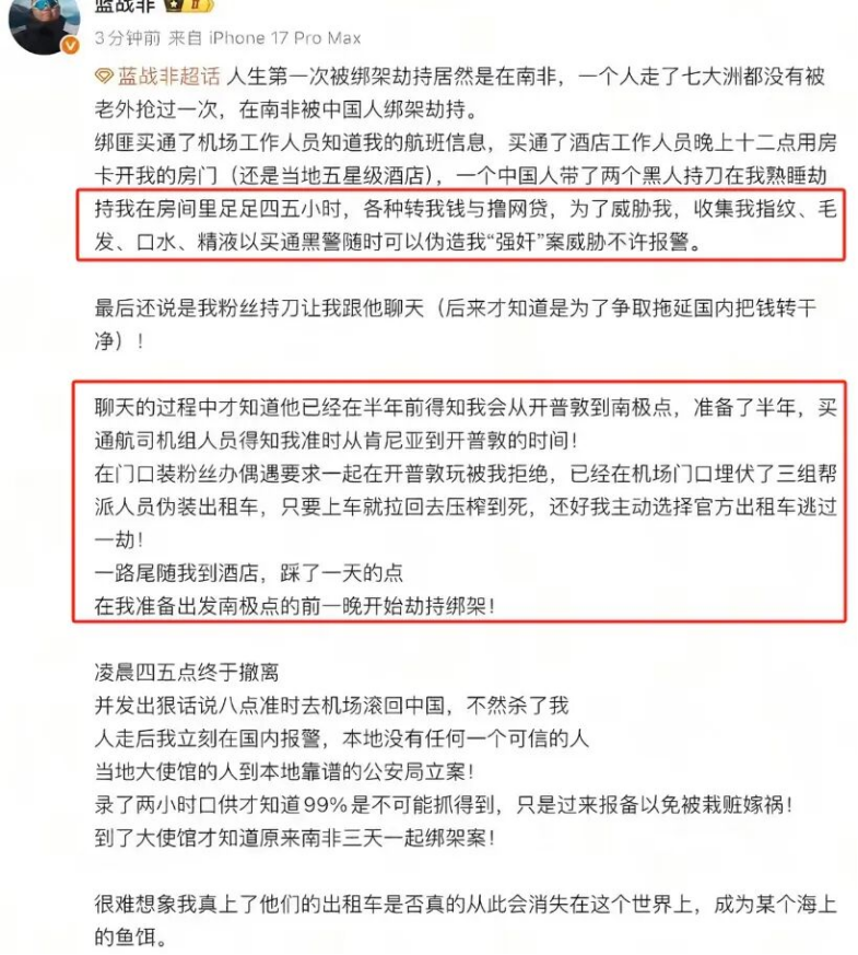 本以为这事逐步就过去了,没想到蓝战非最近直接在微博上爆料,自己在南非开普敦一家五星级酒店被人闯入房间劫持数小时,同行者或同伙中有华人和两名黑人,绑匪据称掌握其行程(疑似买通机场与酒店人员),强行索要转账、逼其申请网贷,甚至采集指纹、毛发和其他生物样本如精液,意在以“造证”威胁受害者“强奸罪”,从而逼迫蓝战非不能及时报警。事后他向国内报警,并有消息说他损失超过千万人民币;下面就是当时的帖子,不过根据最新蓝战非的微博页面,这个帖子已经被删除。