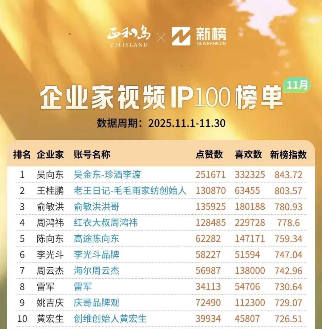 在正和岛联合新榜发布的《企业家视频IP100榜单(11月)》中,吴向东IP名列第一,超过俞敏洪、周鸿祎和雷军。