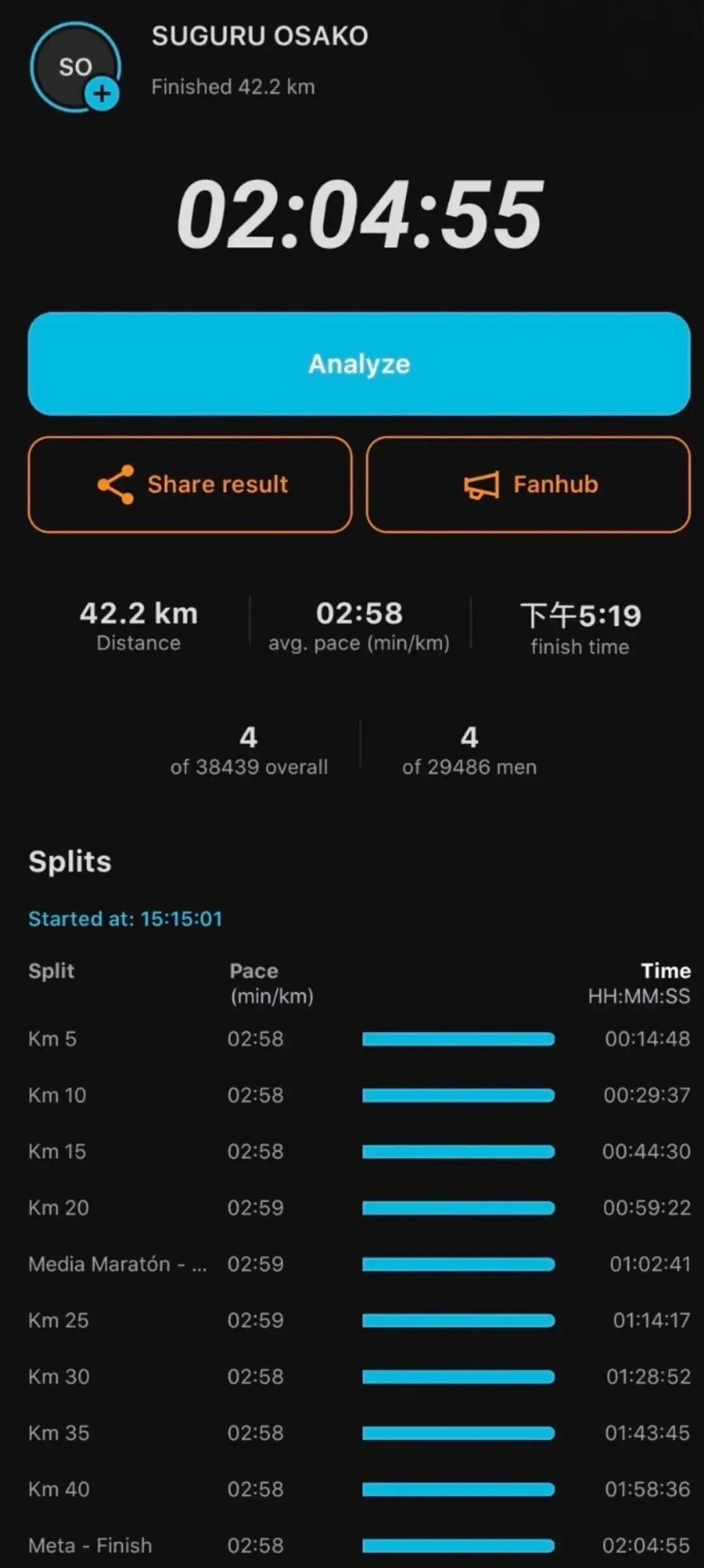 大迫杰的瓦伦西亚马拉松成绩是2小时04分钟55秒,而高驰跑表给出的预测是2小时04分钟54秒,几乎一模一样!