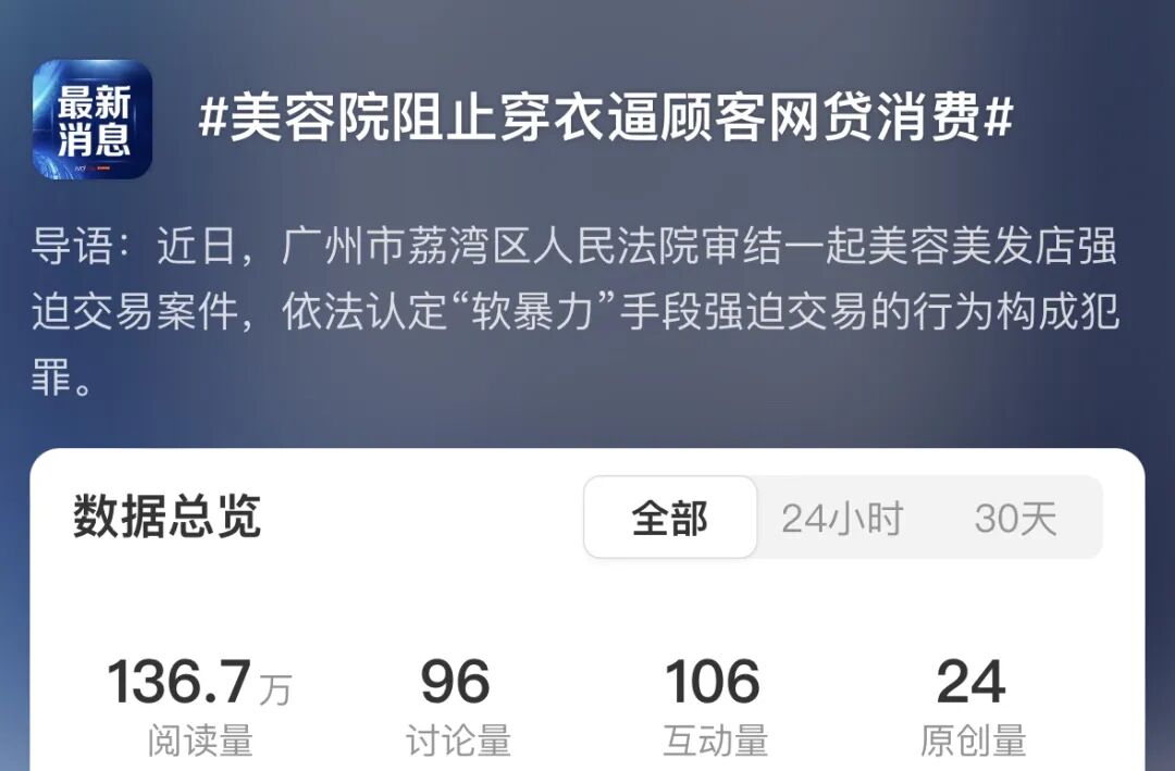 甚至点个外卖,寄个快递,平台也得给你分个期,来个月付……取个快递跳转3个APP,这届网友快被互联网巨头折磨疯了、点份外卖也被偷偷分期,放贷已经喂不饱互联网巨头了?总以为,这些套路是网贷机构放贷的底线了,但直到看到今天的一个热搜话题,小柴才恍然大悟,他们为了放贷,是没有底线的。这个热搜话题是,美容院阻止穿衣逼顾客网贷消费……