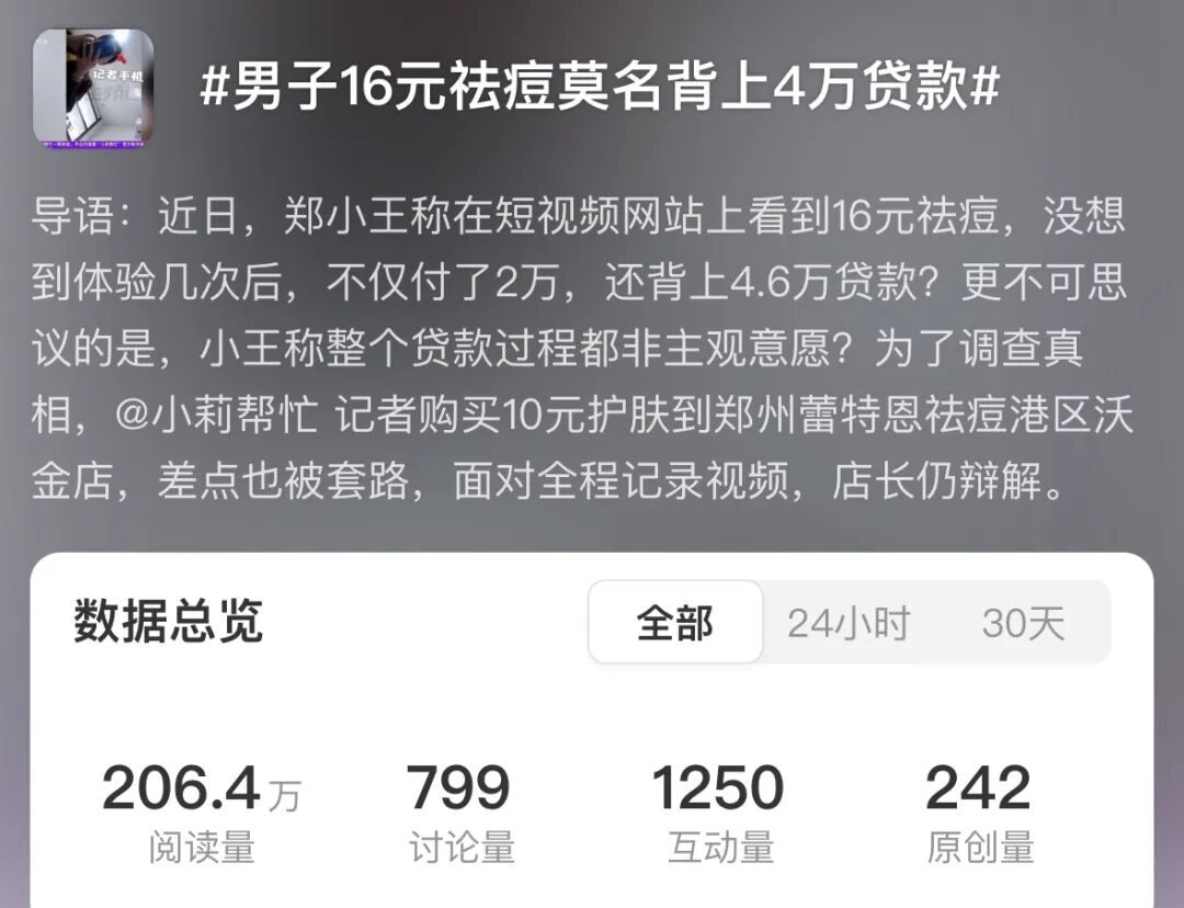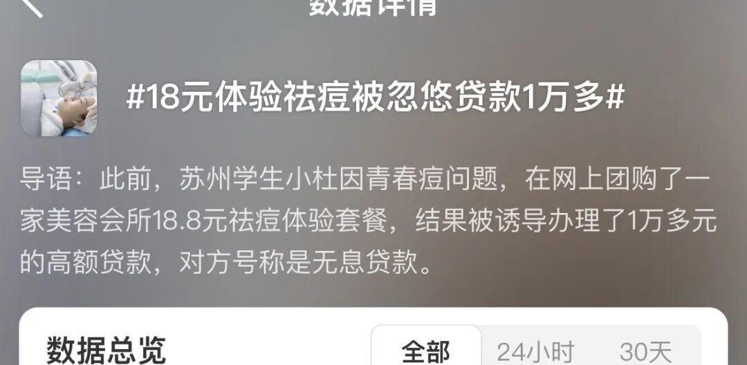 而这位顾客遭遇的就是上述套路,「店员拿我手机扫我脸,帮我操作贷款了4万。」类似的还有今年3月份曝光的一个案例,苏州学生小杜因青春痘问题,在网上团购了一家美容会所18.8元祛痘体验套餐,结果被诱导办理了1万多元的高额贷款,对方号称是无息贷款。后来,小杜发现合同中含有高额利息。