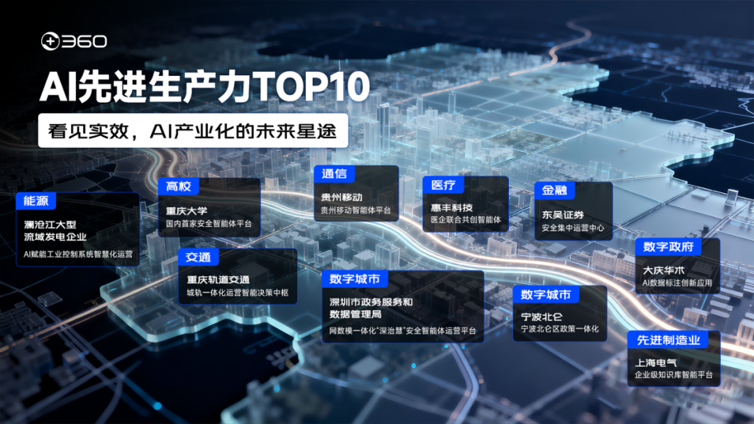 其相关洞察已被互联网女皇、硅谷传奇投资人Mary Meeker、全球领先的战略管理咨询公司罗兰贝格等国际权威人物与机构引用,成为业界观察AI应用落地趋势的核心窗口之一。今年360与纳米AI入选年度AI双榜单,向外界传递出一个明确信号:以安全闻名的360,正在产业AI的赛道上展示出意外的锋芒。更值得关注的是,与这份榜单几乎同步浮出水面的,还有一份名为“AI先进生产力TOP10”的案例集。从高校、能源、金融到政务、交通、医疗,这十个案例像一张精心绘制的地图,全景式地展示了AI如何深入中国产业经济的毛细血管。