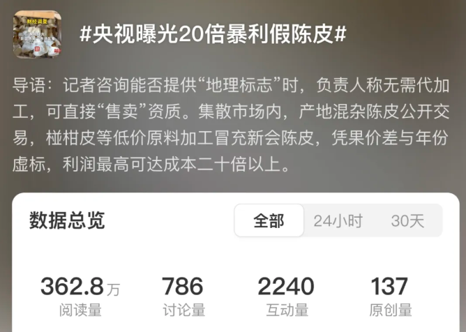 然而,让人不解的是,为何商家明目张胆地虚假宣传,平台总是睁眼瞎呢?而这些商家,则更是将良知扔进垃圾桶疯狂地捞金,前几天,小柴曾报道了这些年备受健康养生人士追捧的陈皮塌房事件陈皮塌房成最大智商税!地理标年份随便贴成本70元工艺皮卖上千……这些陈皮商家,为了抓住陈皮突然热销的红利,产业链开始疯狂的倒卖地理标,串通起来,将成本几十块的工艺成品,包装成年份成品,卖出上千的高价。