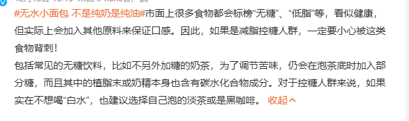 也有减肥人群称,又一次被背刺了!“市面上很多食物都会标榜无糖、低脂等,看似健康,但实际上会加入其他原料来保证口感。因此,如果是减脂控糖人群,一定要小心被这类食物背刺!”