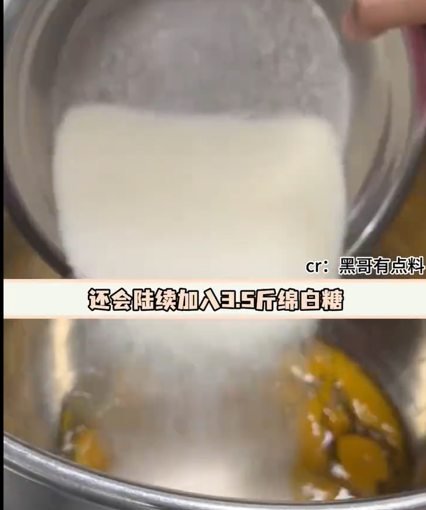 说好的没有一滴水,竟然是3.2斤油,这你受得了吗?但这还没完,随后他用这些油去浸泡肉松,然后让肉松去充分吸收这些油,再准备面粉和鸡蛋,然后,倒进去了3.5斤的白糖。