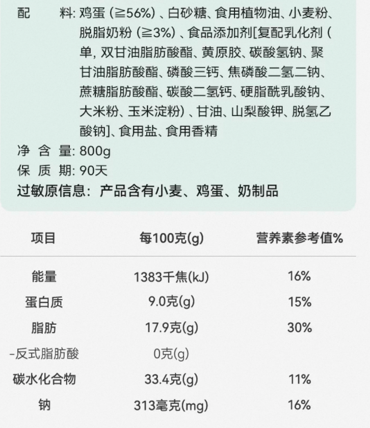 再看看热量表,100g的热量高达1383kJ,也就是吃这么个小玩意,小柴每天跑的十公里,等于白跑了啊!而在他们只是在宣传中,着重强调无水、纯奶或蛋液,对加了植物油这件事是只字不提。而所谓的健康只不过是一场通过营销误导出来的大骗局,他不仅利用普通消费者朴素认知的信息差,还在宣传中,通过避重就轻,刻意误导消费者。看到这一幕,有网友直呼:天塌了!