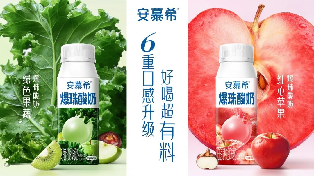 具体来看,酸奶赛道龙头品牌安慕希将推出全面升级的爆珠酸奶,绿色果蔬爆珠酸奶和红心苹果爆珠酸奶,红心苹果款含原切大块苹果颗粒,绿色果蔬款融合多种超级果蔬食材。值得注意的是,该产品依托自研4层包埋技术,6 项技术专利背书,添加 BC99 活性益生菌双爆珠、清爽水果颗粒和脆爽马蹄颗粒,搭配饱满燕麦和爽滑酸奶,全新升级6重口感,旨在进一步扩大安慕希爆品规模,巩固其“一超多强”的品类领先地位。
