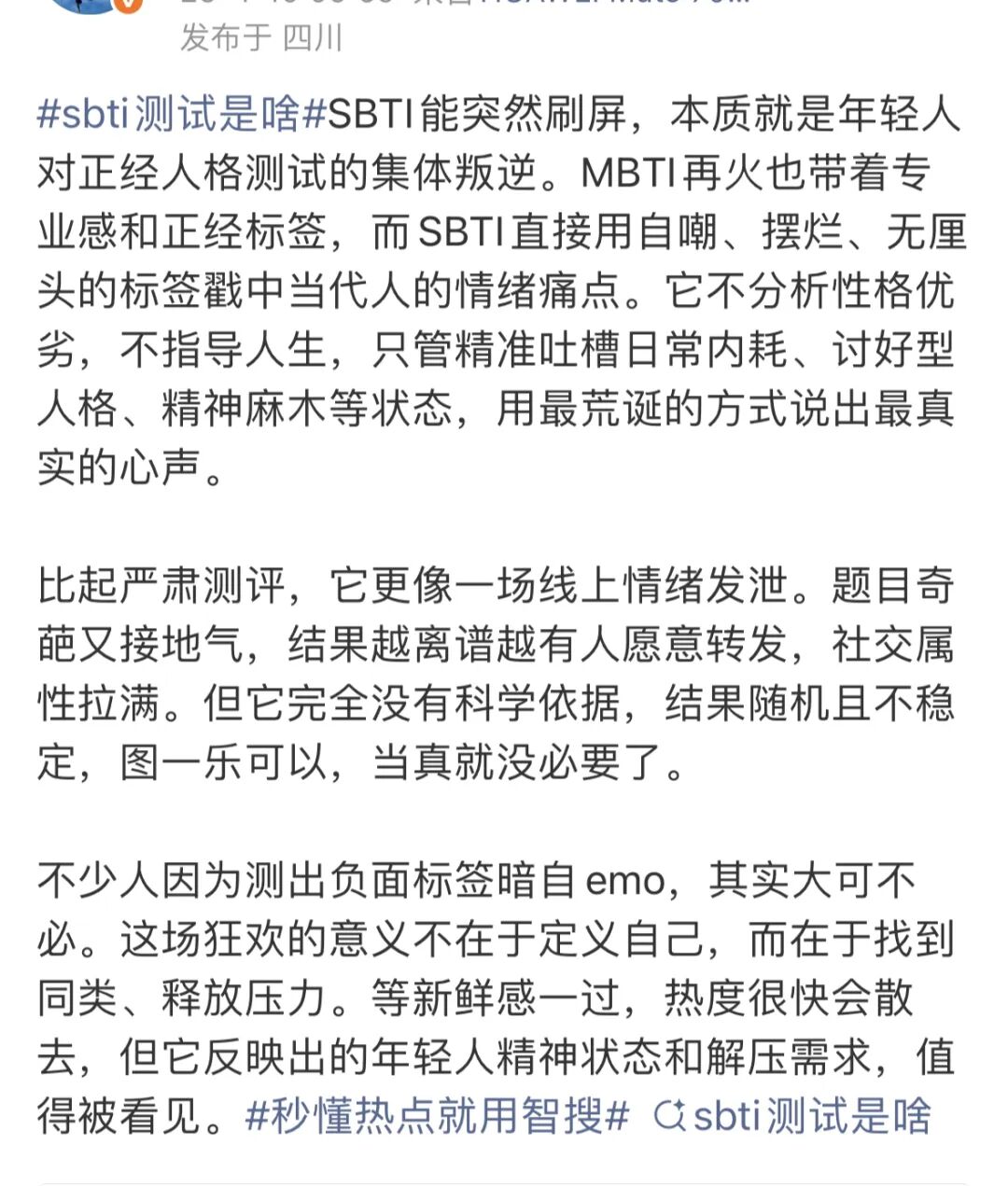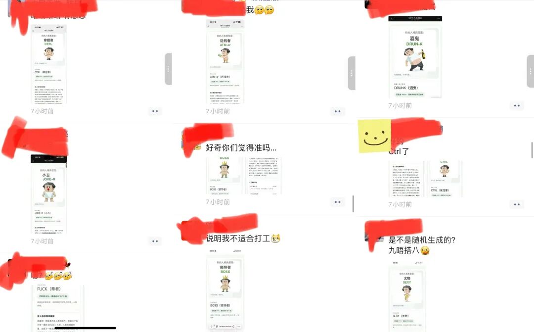 另一方面,这种自嘲式又能表达个体生活状态的测试结果,很容易让人分享出去,在社交媒体上寻找共鸣成为社交货币,引发病毒式传播。此外,这个测试仅需1分钟,无需注册,随机生成的奇葩结果,成为朋友圈、群聊的搞笑话题,快速拉近社交距离。换句话说,SBTI的爆火,实际上是一次通过网络应用的集体情绪泄洪,而这些测试结果,也恰好成了一种情绪释放的载体。比如有网友对此表示:「SBTI能突然刷屏,本质就是年轻人对正经人格测试的集体叛逆。MBTI再火也带着专业感和正经标签,而SBTI直接用自嘲、摆烂、无厘头的标签戳中当代人的情绪痛点。它不分析性格优劣,不指导人生,只管精准吐槽日常内耗、讨好型人格、精神麻木等状态,用最荒诞的方式说出最真实的心声。」