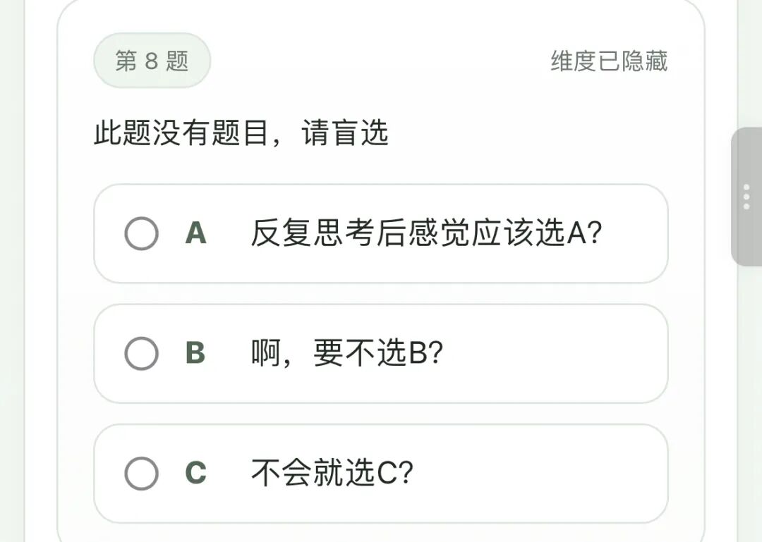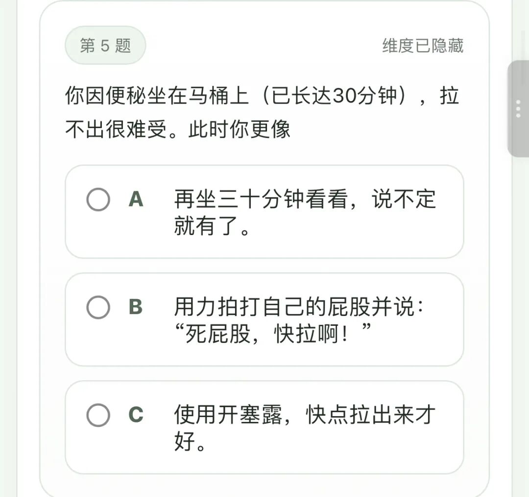 小柴也是第一时间体验了一下,该测试是以MBTI为框架推出荒诞的戏称,与MBTI一本正经不同。题目设计充满生活化矛盾情境,小柴随便截图几个问题,柴油们感受下,比如下面这样的:
