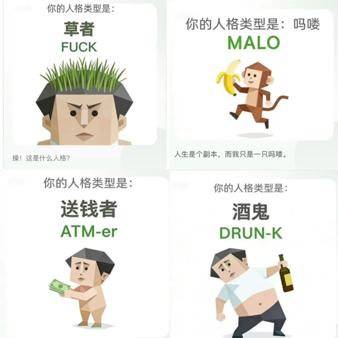 类似的还有自我攻击者(IMSB)是一边我冲了,一边我是个傻*的内耗人不过,不少网友发现,这个测试疑似依赖半随机算法,同一用户多次测试可能从「死者」变「吗喽」;那么简单来说,这就是一个娱乐性的测试,而其突然爆火背后原因是多样性的。一方面,该测试精准戳中了当代打工人的内耗、摆烂式的生活状态,比如「装死者(ZZZZ)」讽刺拖延症——死线前爆发潜力,「吗喽」呼应躺平哲学……