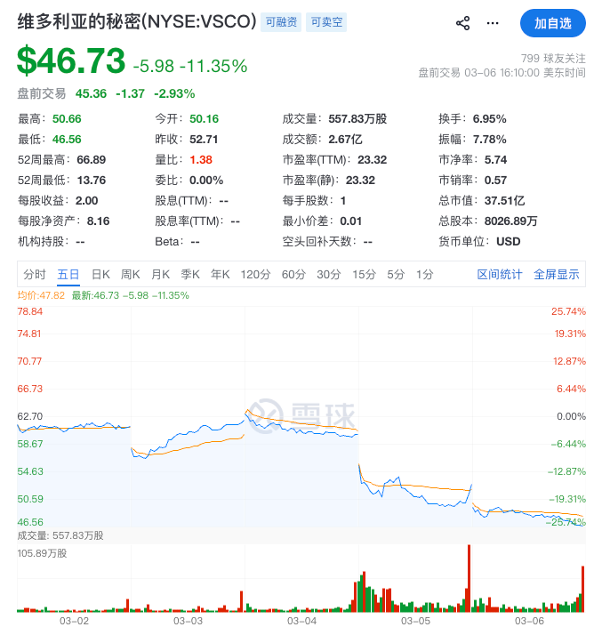 这听起来像是一个“复苏故事”的开端,尤其是对一家曾因错过“舒适革命”而陷入低谷的品牌而言,但资本市场并不买账,财报发布后,维密股价接连下跌,3月5日、6日两日累计跌幅超过23%。