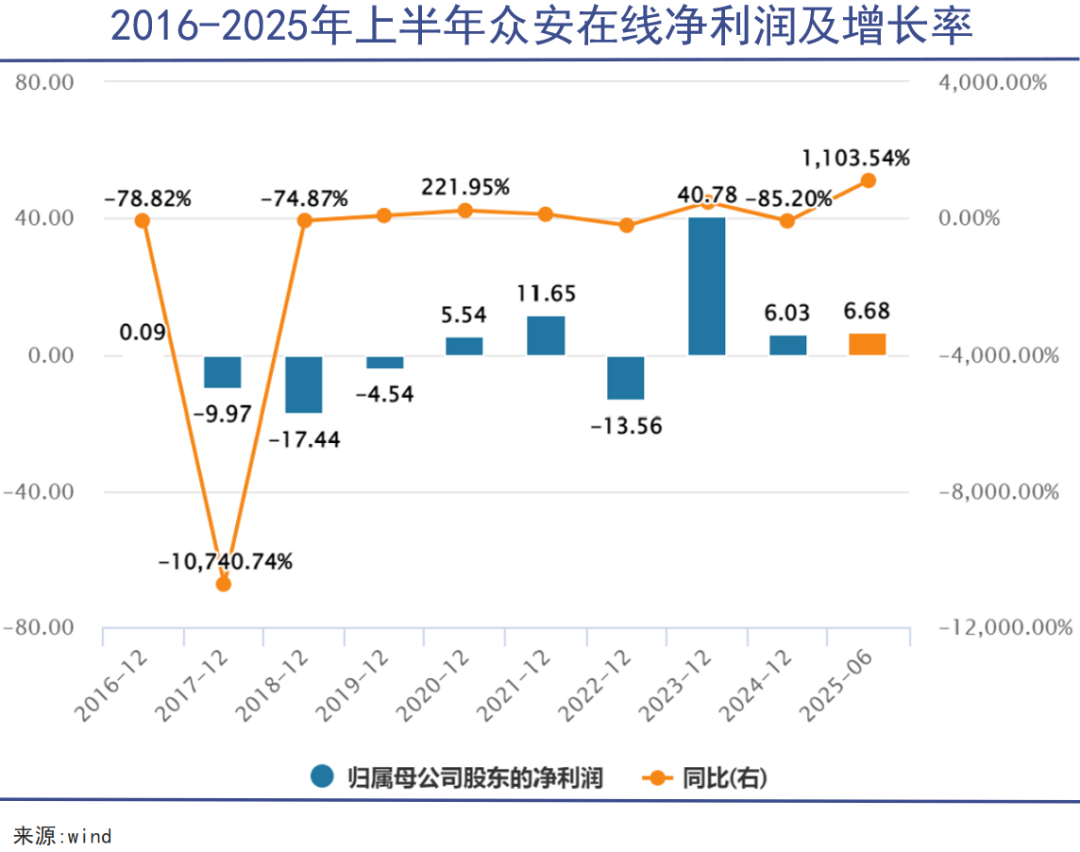 毕竟上市以来,众安在线的营收虽然保持增长,但净利润的表现却起伏不定,2020年第一次实现扭亏为盈,2022年又亏损了13.56亿元,2023年净利润猛增至40.78亿元,随后的2024年又回落至6.03亿元。