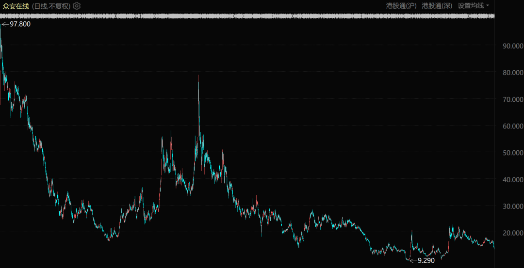 赛道的标志性股票众安在线也是深刻演绎了什么叫出道即巅峰,股价一路下跌,如今已不足发行价的四分之一。