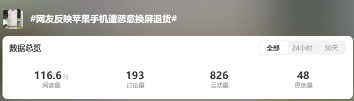 而今日,相关话题也是冲上热搜——网友反映苹果手机遭恶意换屏退货……