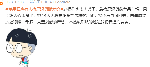 还有网友表示:这操作也太离谱了,靠换屏退货薅苹果羊毛,只能说人心太贪了,把14天无理由退货当成赚钱门路。换个屏再退回去,白拿原装屏还净赚一千多,真查到必须严惩,不然最后坑的还是我们普通消费者。