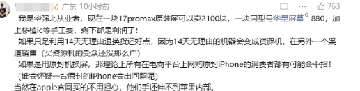 当然,网友们还想到了一个细思极恐的问题,就是这么退回去的手机,必然会二次流入市场,那么是不是意味着,你买到的苹果手机可能是被换屏幕的。这件事被曝光后,是越传越邪乎,比如一位来自华强北从事屏幕批发11年的二手手机卖家博主称,市场上出现了很多带着新机膜的拆机屏,并配上了视频。他表示,最近市场上出现很多没有触摸IC的17Pro系列拆机屏,而且都是带着新机膜的,原来苹果又被薅羊毛了!