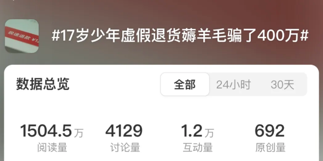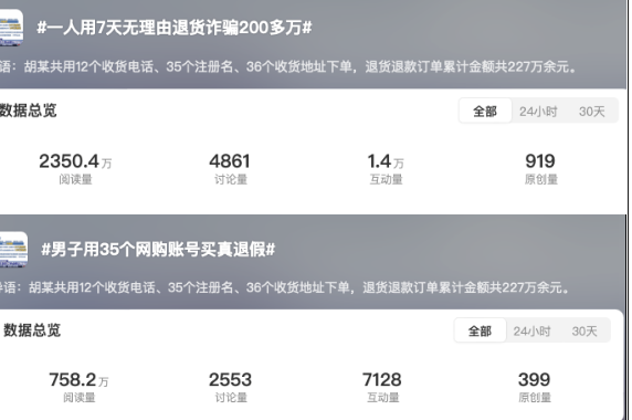 而这还不是个例——227万!又是买真退假0元购!谁正在把商家推向深渊?,即一男子用35个账号网购,以平台无理由退货等在电商平台买真退假骗取了商家227万。