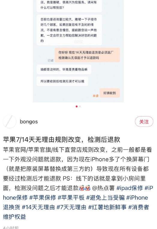 检测会覆盖屏幕、主板、触控IC、内部组件等,确认设备未被拆修、无换屏、无硬件篡改、完全为原始出厂状态后,才会启动退款流程;一旦查出拆修、换屏、缺失原厂芯片等问题,直接拒绝退货,并按相关规则处理。对此,有网友表示:苹果的售后都是这么被人玩坏的,以前多好……