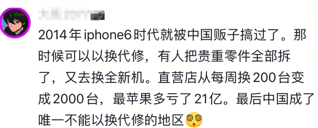值得注意的是,还有用户提到了多年前,苹果也被这么薅过羊毛的事,该网友表示,在iPhone6时代,苹果就被这么搞过,有人把零件全部拆了,又去换新机,直营店每周换200台,变成2000台,亏了21亿。