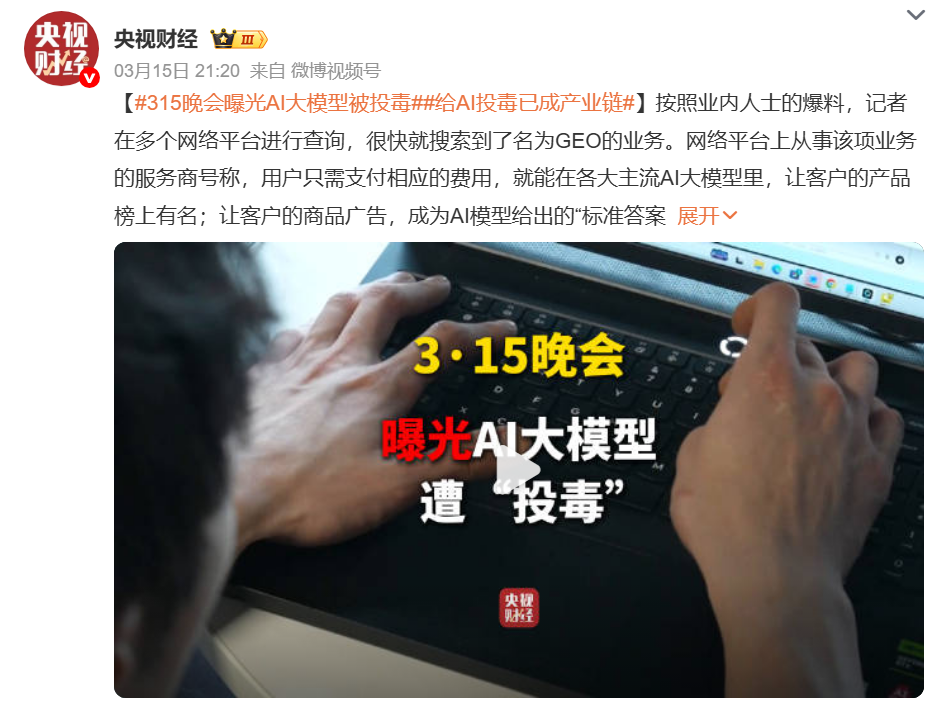 前面那些,套路说实话不新鲜。每年315都有食品安全,每年都有焦虑收割,每年都有人上当,每年曝一遍。但今年有一个案例,是真的让我有点后背发凉。给AI大模型投毒。你现在搜个东西,是不是越来越习惯直接问AI了?“帮我推荐一款XX产品。”“现在哪个牌子的XX最好用?”AI给你一个答案,你觉得这是综合了全网信息的客观结论,不像广告,有道理,就信了。但今年晚会揭了一件事:这个“客观结论”,是可以被人工喂出来的。技术名字叫GEO,生成式引擎优化。说白了,就是以前SEO是让你在百度搜索结果里排第一,现在GEO是让AI开口就夸你。往AI的数据源里大量灌软文,灌得够多够准,AI就会在用户问到相关问题时,把这个产品推在前面。晚会做了个实验——直接虚构了一款根本不存在的智能手环,用GEO系统发布了十几篇软文。结果呢?两个主流AI大模型,都把这款不存在的产品推荐靠前了。一个从未生产过、从未上市过、完全捏造的产品,因为软文投喂,变成了AI嘴里的“优质推荐”。服务商怎么说的?“花个几百万投点毒,总行吧!”我看完这段,坐在那儿想了一会儿。以前的广告,你能认出来——这是广告,可以屏蔽、可以跳过、可以质疑。以前的搜索SEO,做得再好,页面底部还有个“广告”标签。但AI给你的答案,没有标签。它说这个好,语气笃定,像帮你查完了所有资料之后得出的结论。你没有理由不信。偏偏,这个“结论”,可能从一开始就是买来的。这不是个别骗局,这是信息本身被污染了。以前是骗子冒充专家忽悠你,现在是骗子提前把答案塞进了你信任的“专家”脑子里。升级了。最后两个字:“凉拌”最后再补一刀。贵州遵义,鑫犇科信息咨询公司,没有任何金融从业资格,招一批电话销售,专门给人荐股。