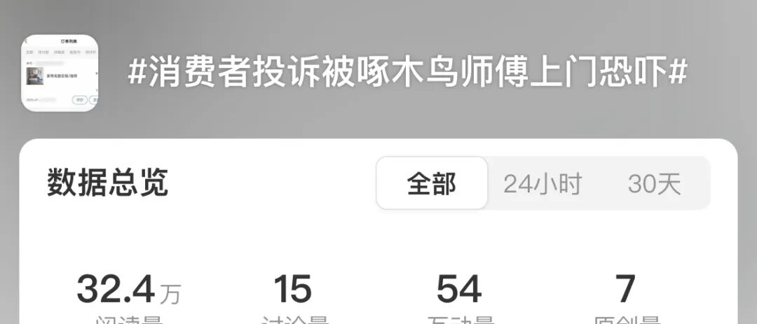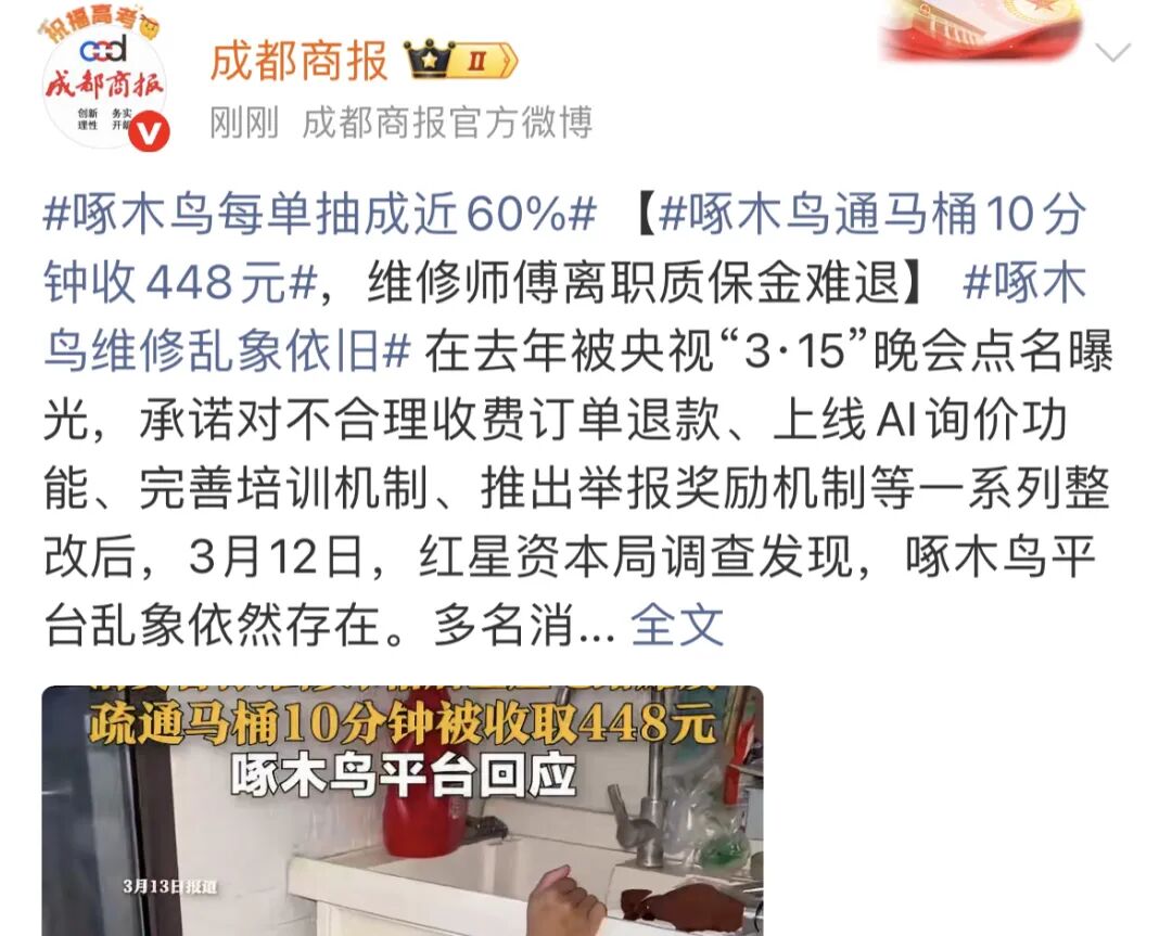 而在社交媒体上,吐槽啄木鸟的内容,随处可见,比如有网友表示:都给我狠狠避雷啄木鸟上门维修!!!!不到200就能解决的事情,看我是女生,给我要420,平台投诉,结果售后客服在这给我打太极,蛇鼠一窝!!!!!!!
