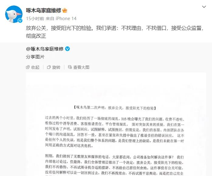 而啄木鸟官方则回应:放弃公关,接受阳光下的检验,我们承诺,不找理由,不找借口,接受监督,彻底改正。
