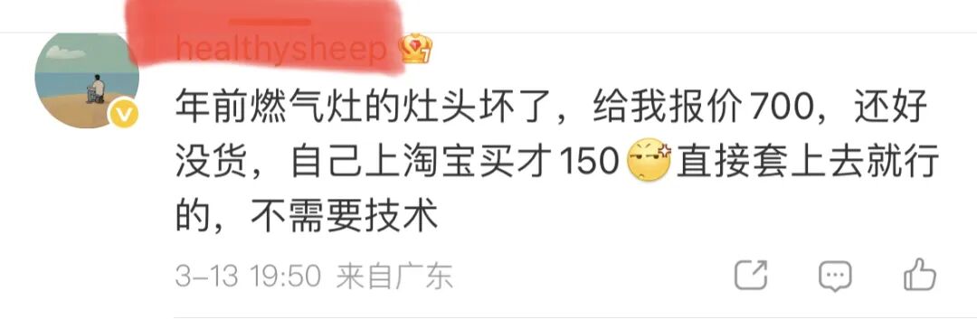 「年前燃气灶的灶头坏了,给我报价700,还好没货,自己上淘宝买才150,直接套上去就行的,不需要技术」