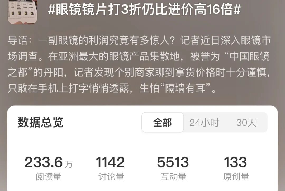 而今日的一条热搜,更是进一步具象化了小柴对眼镜行业暴利的认知,这个热搜话题是,眼镜片打三折仍比进价高16倍。