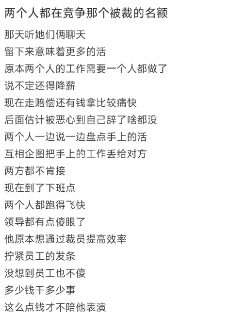 有人发帖表示,两个人都在竞争那个被毕业的名额,那天听他们聊天,留下来意味着更多的活,原本两个人的工作需要一个人都做了,说不定还得降薪,现在走赔偿还有钱拿比较痛快……