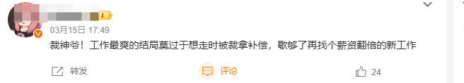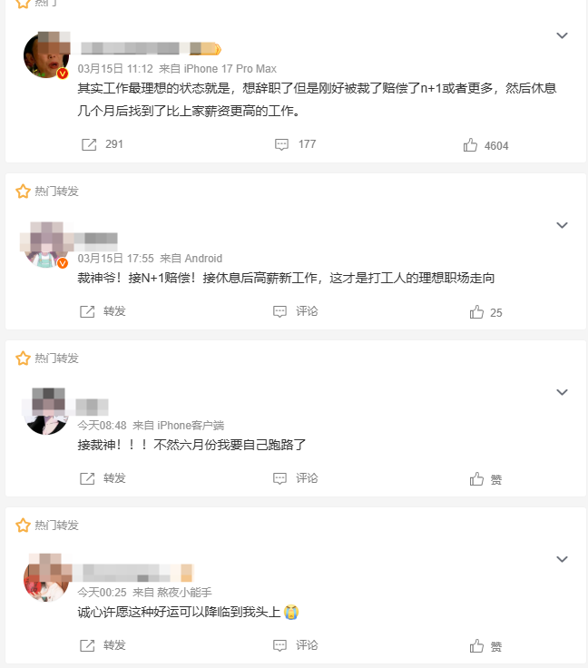 “接裁神!!!不然六月份我要自己跑路了”“诚心许愿这种好运可以降临到我头上”“裁神爷!工作最爽的结局莫过于想走时被毕业拿补偿,歇够了再找个薪资翻倍的新工作”