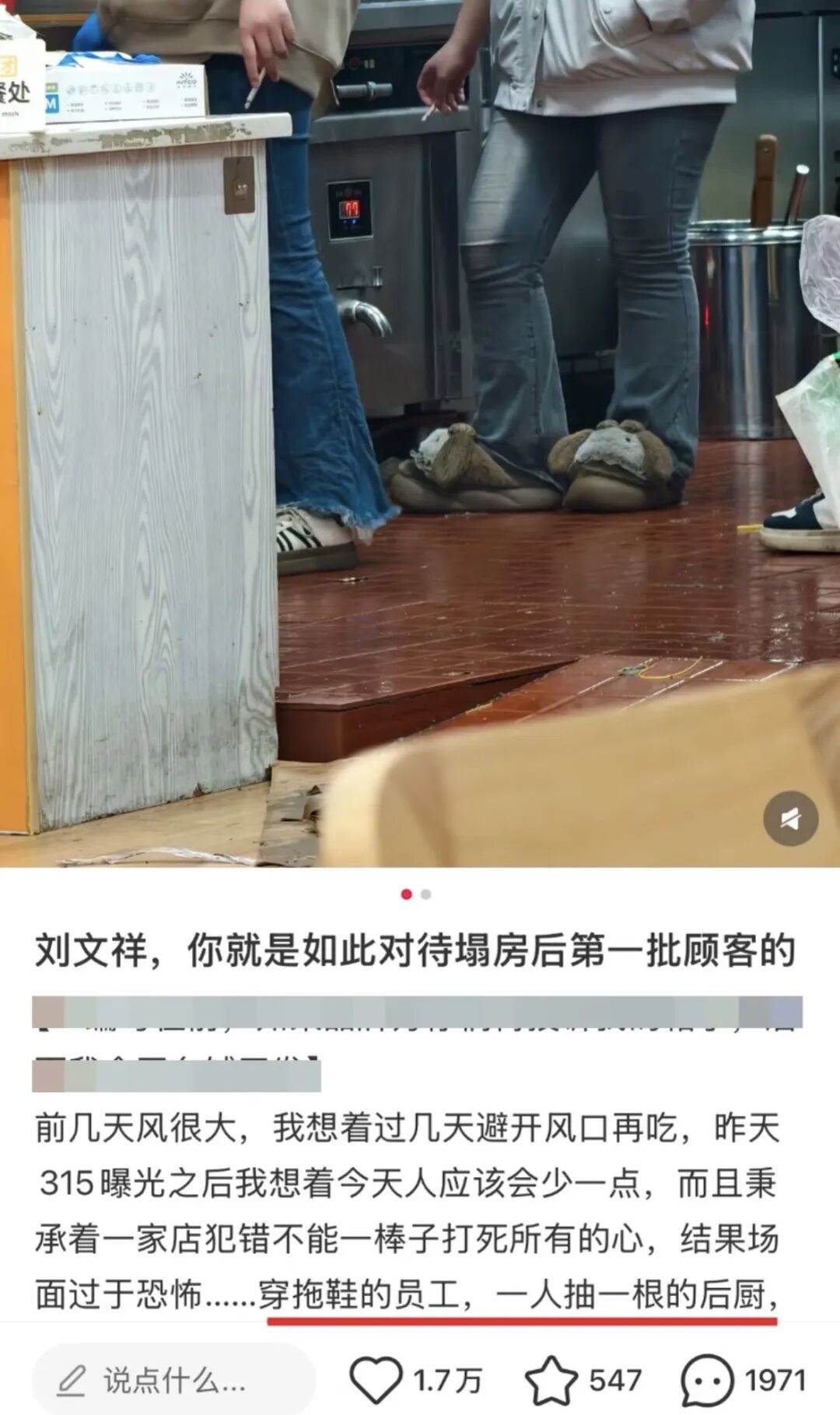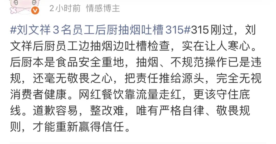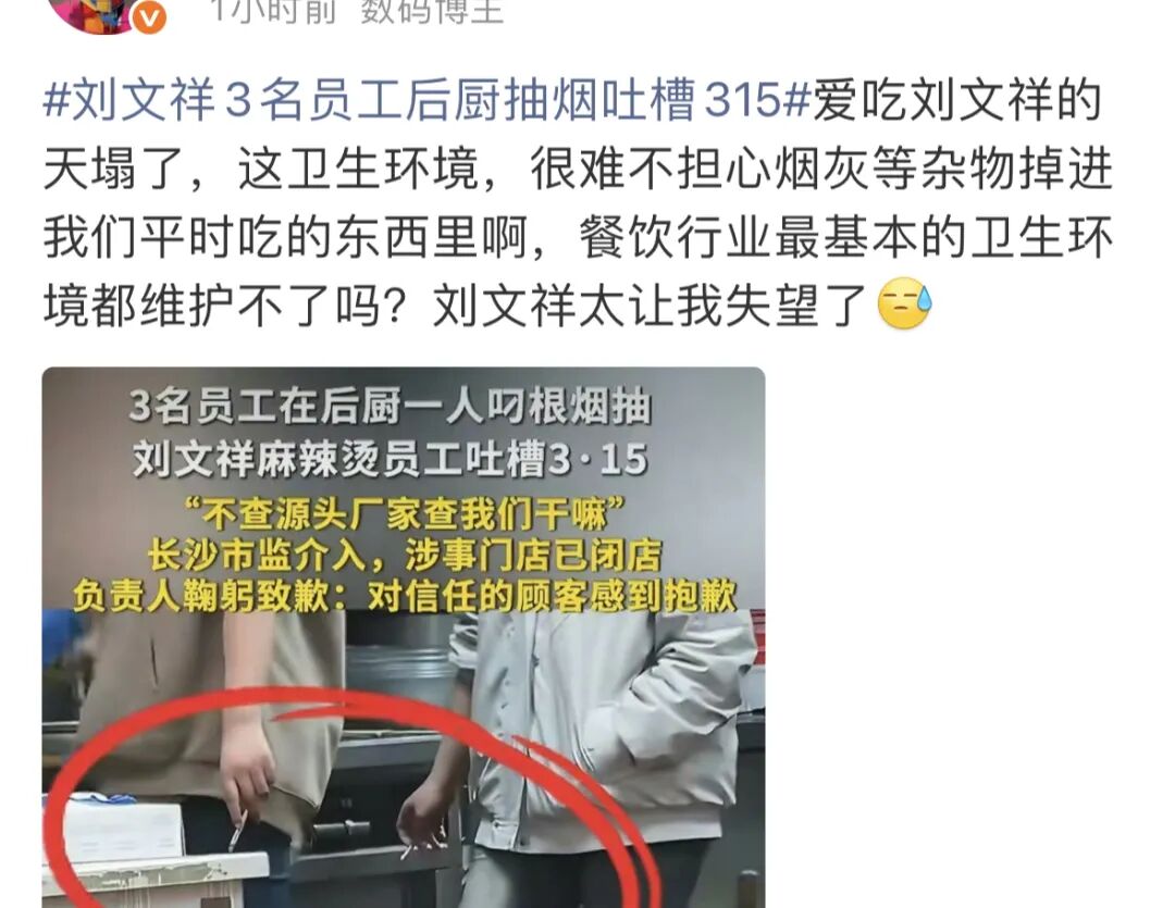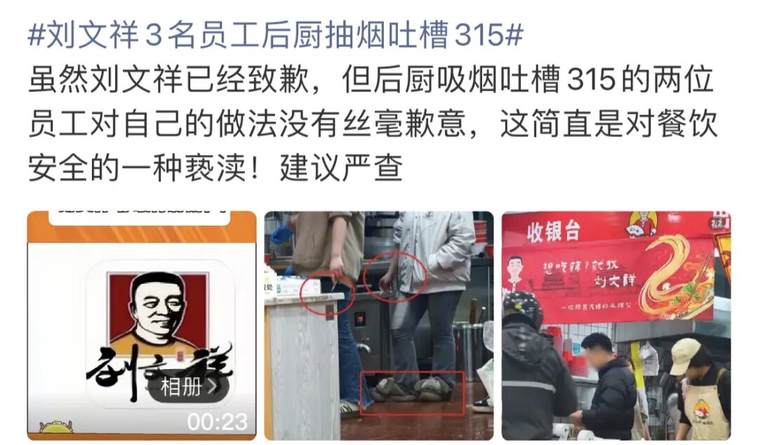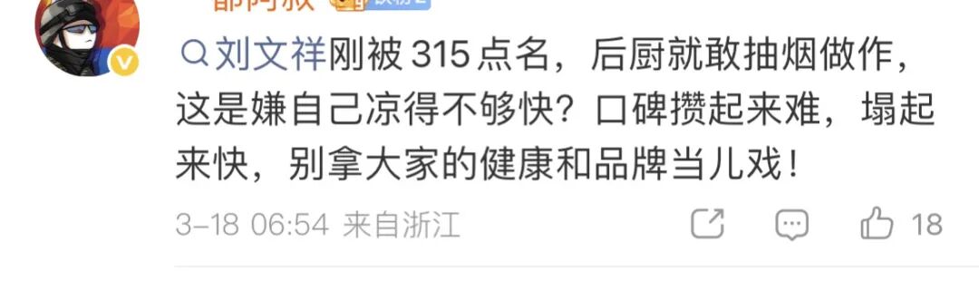 还有网友表示:「刘文祥刚被315点名,后厨就敢抽烟做作,这是嫌自己凉得不够快?口碑攒起来难,塌起来快,别拿大家的健康和品牌当儿戏!」