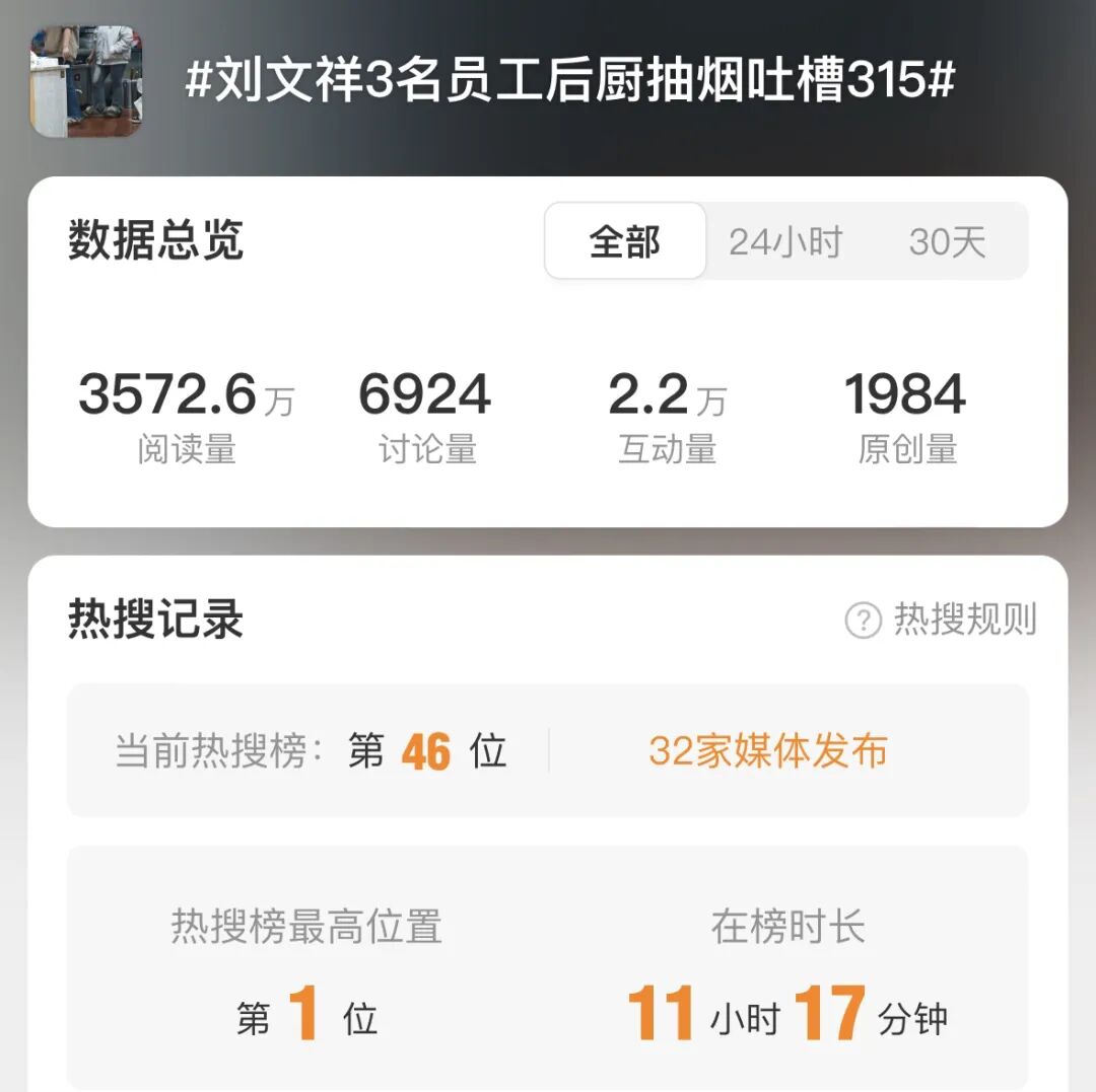 这个话题是——刘文祥3名员工后厨抽烟吐槽315。