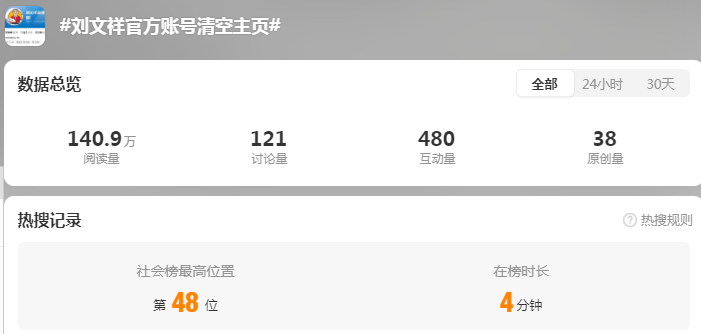 此外,今日,又有关于刘文祥麻辣烫的话题冲上热搜——刘文祥官方账号清空主页。