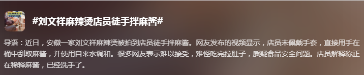 然而,315结束后,刘文祥员工接二连三的又给自己的品牌捅刀子,比如昨日,刘文祥麻辣烫又被爆出员工徒手拌麻酱。