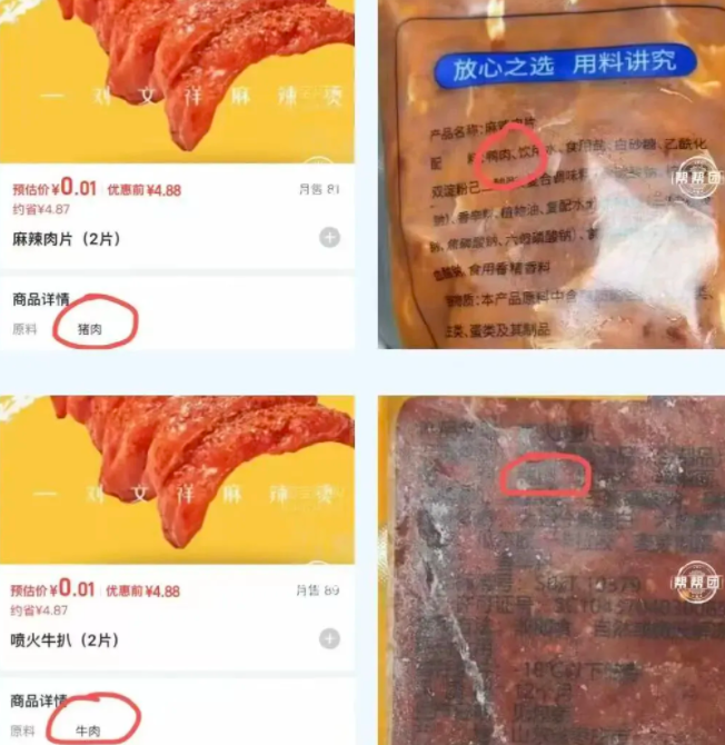 此外,目前,外卖平台中,刘文祥迅速将商品名称从“牛肉丸”改为“肉丸”、“肥牛卷”改为“肉卷”。
