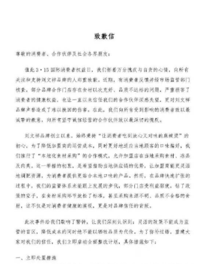 然而,不少网友发现,这份道歉信发布后不久就已被官方删除。刘文祥麻辣烫总部回应称,店内生意因为此事受到了影响。
