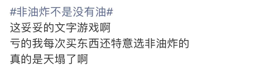 「这妥妥的文字游戏啊,亏的我每次买东西还特意选非油炸的,真的是天塌了啊」