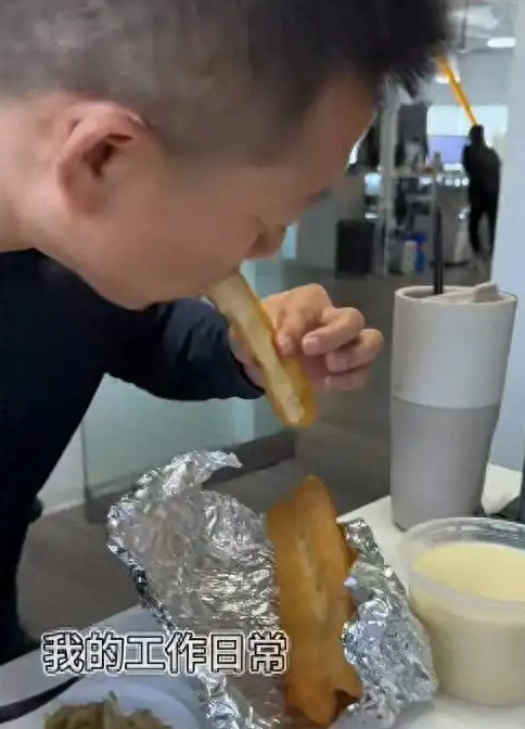 再比如还有一次,他晒出自己吃油条喝豆浆的画面,那叫一个吃得心酸。