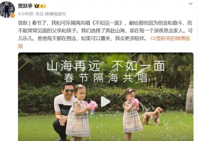 再比如今年春节期间,贾跃亭远在美国的贾跃亭发布了一条视频,与女儿隔海共唱《不如见一面》。