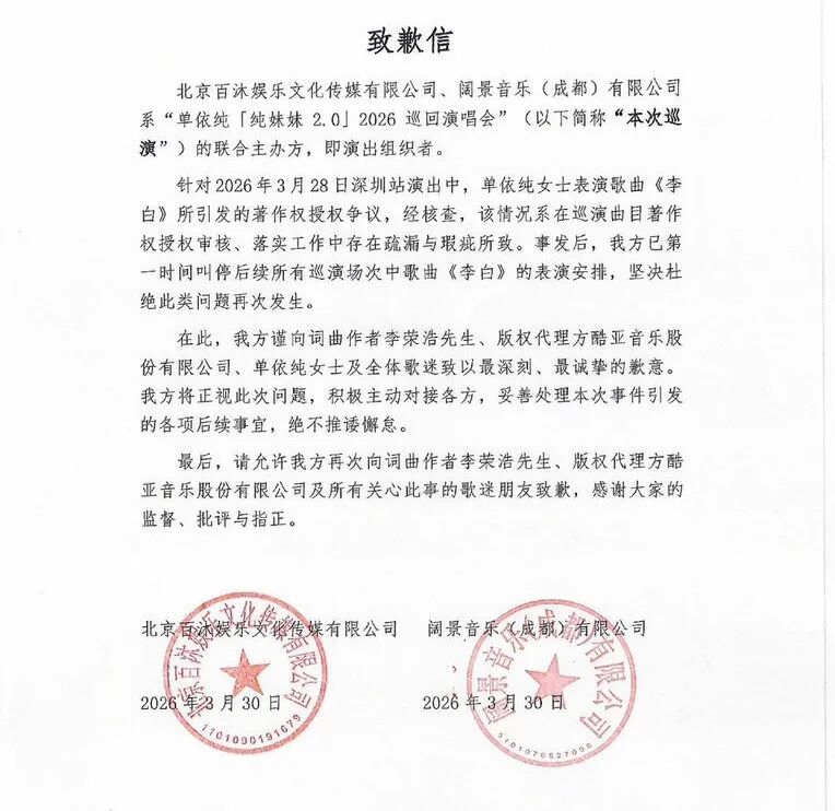 眼看事情闹大,舆论翻车,单依纯方终于坐不住了。首先是演唱会主办方(百沐娱乐和阔景音乐)火速发布致歉信。