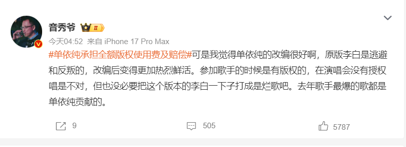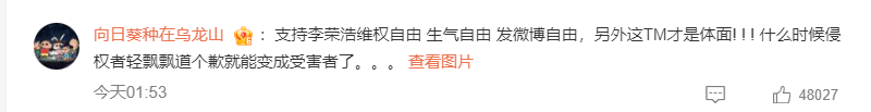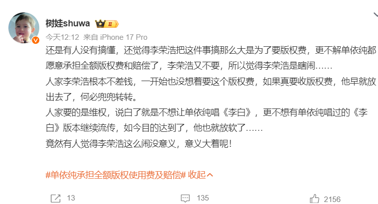 还有大V直言:“李荣浩根本不差钱,他就是不想让单依纯唱,不想让这个版本流传。支持李荣浩维权自由、生气自由!什么时候侵权者轻飘飘道个歉就能变成受害者了?”